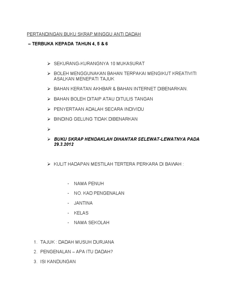 Edaran tajuk syarat-syarat pertandingan mewarna melukis posterdeklamasi sajakbuku skrap antidadah. 19 Feb-Mac Sempena Hari Anti Dadah Kebangsaan 2. Ia meliputi isi-isi keratan.